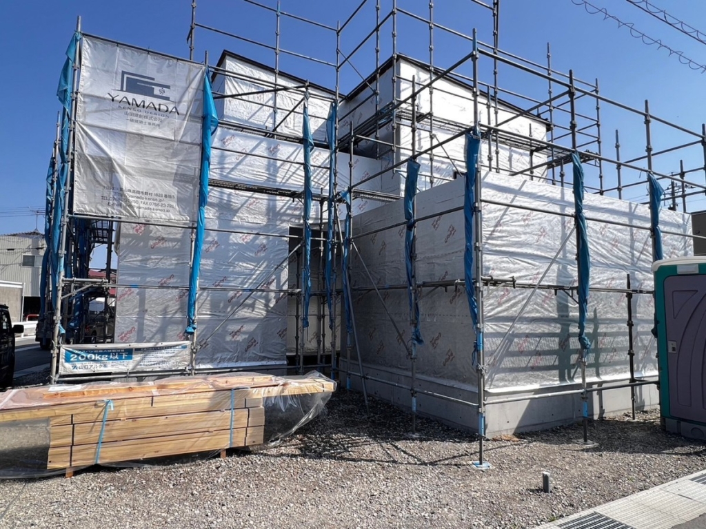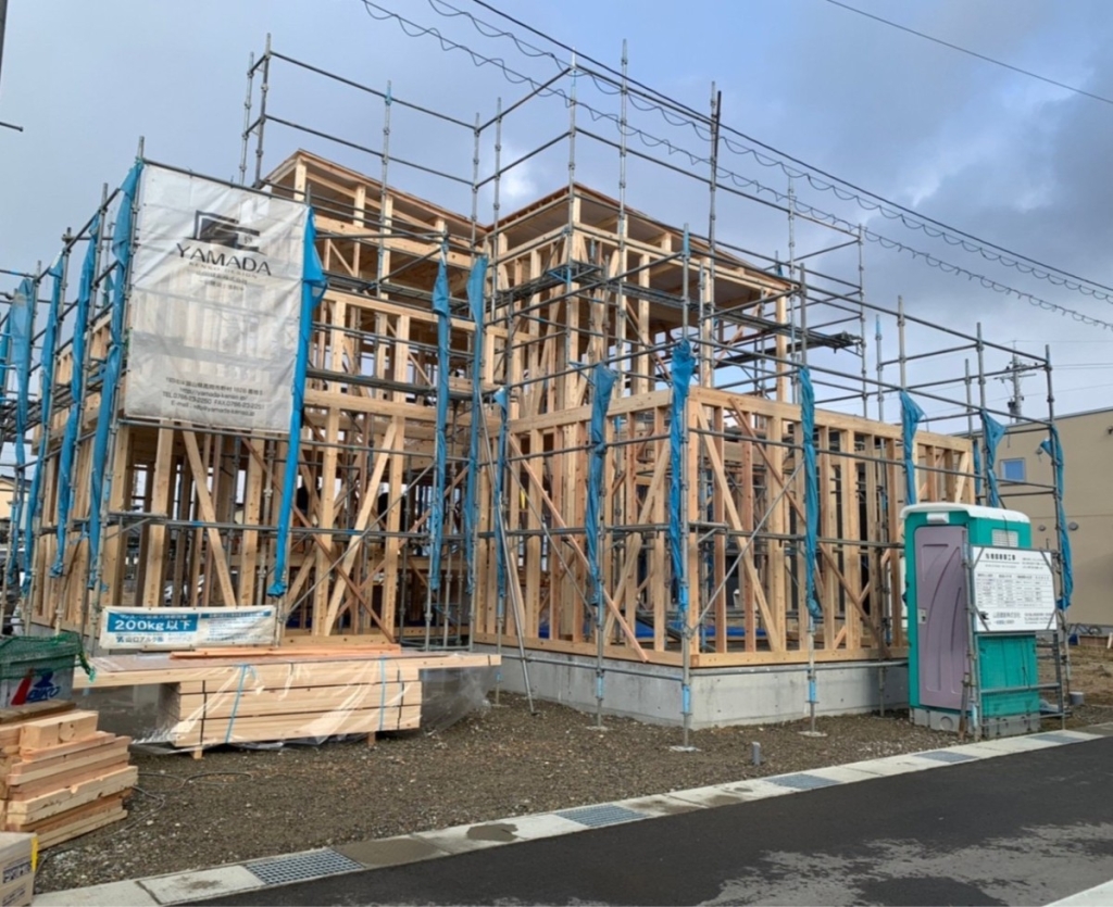 ピンと空気が張りつめた朝、2月末ではありましたが、お天気にも恵まれ無事上棟が終わりました!ピンと空気が張りつめた朝タイベックシートも施工し、雨仕舞もばっちりです。