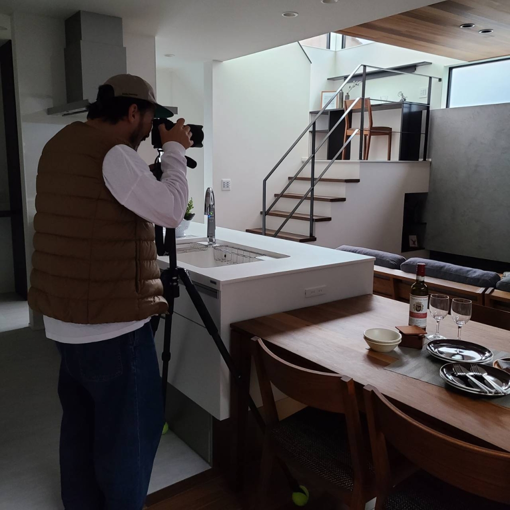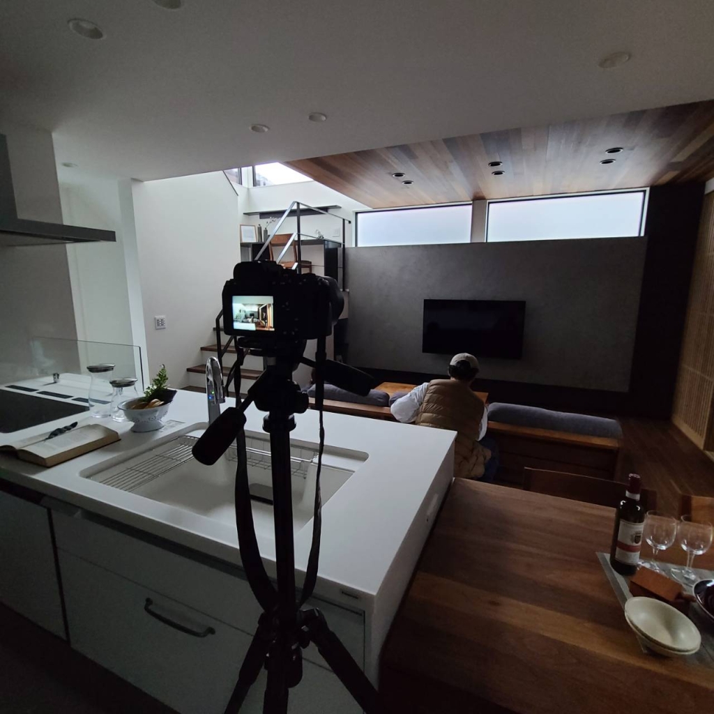パンフレット用の写真撮影です。ファインダーを覗き、家具の位置など微調整をしながら撮影されていました。レンズ越しだとまた見え方が変わりますね!