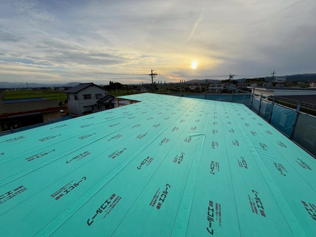 先日、無事に上棟を終えました。夕暮れの大屋根からの景色が印象的で、秋の深まりを感じる静かで美しいひととき。施主様の新しい暮らしの始まりに、季節の移ろいがそっと寄り添うような、そんな一日でした。