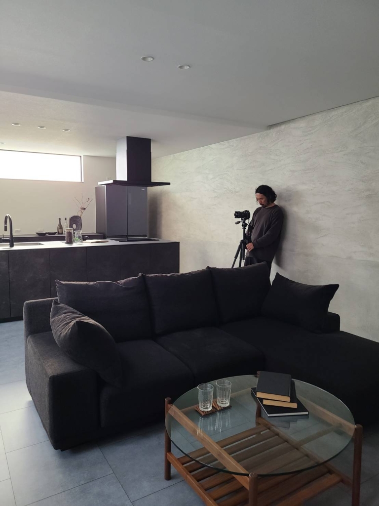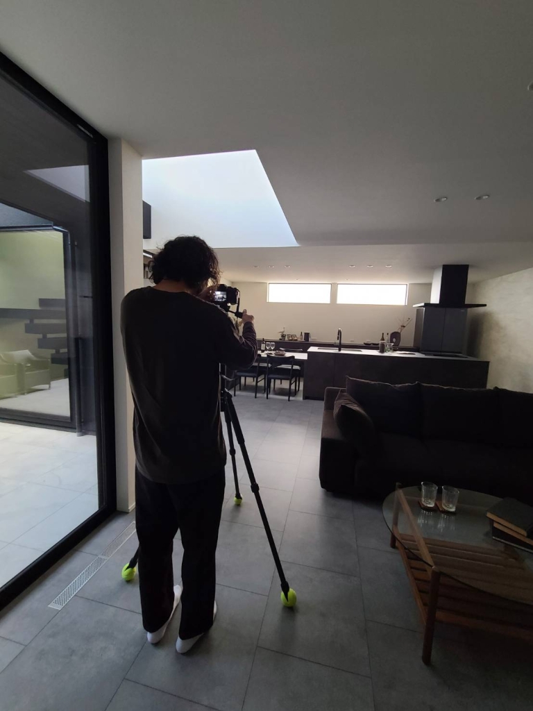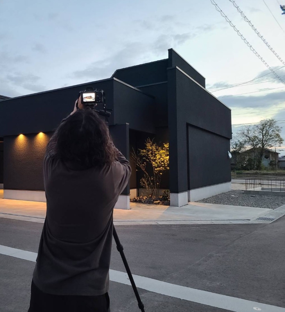 日も長くなり、夕暮れのジャストタイムを待ちつつ、室内撮影を進めました。カメラマンさんの立ち姿からも伝わるスケール感のあるリビングです。自然光の優しい色合いを丁寧に撮影していただきました。